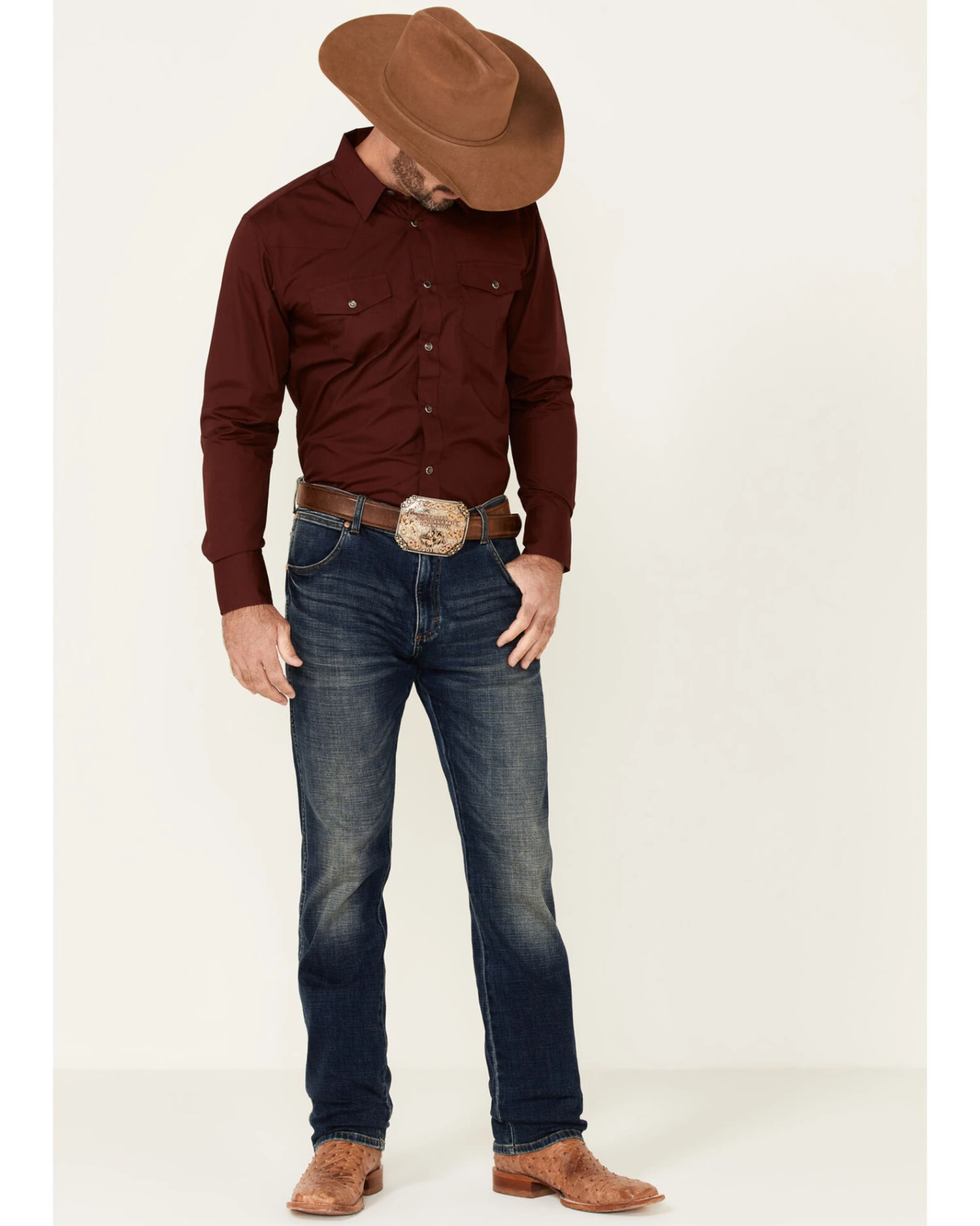 Gibson Men’s Burgundy Basic Solid Long Sleeve Pearl Snap Western Shirt